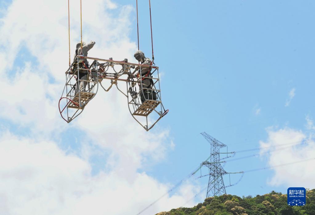 5月4日,在福建省寧德市洪口鄉,直升機將國網(wǎng)福建超高壓公司帶電班檢修工周曉剛(右)吊往檢修點(diǎn)開(kāi)展輸電線(xiàn)路帶電檢修作業(yè)。
