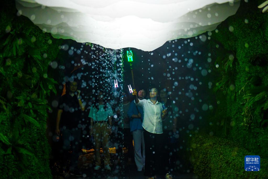 5月4日,游客在新昌穿巖十九峰景區夜游項目“山海經(jīng)奇”中觀(guān)賞洞窟雨滴。