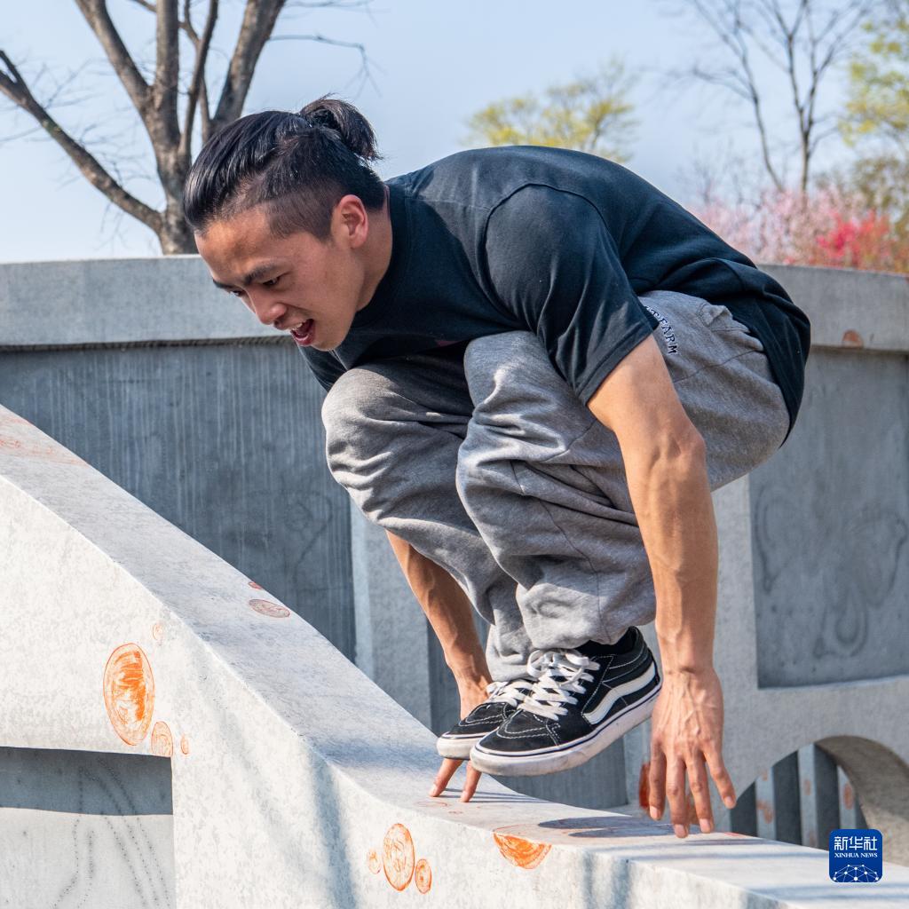 2023年3月14日,重慶躍飛跑酷隊員文舜堯在重慶金州公園拍攝跑酷視頻。
