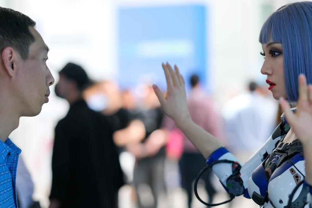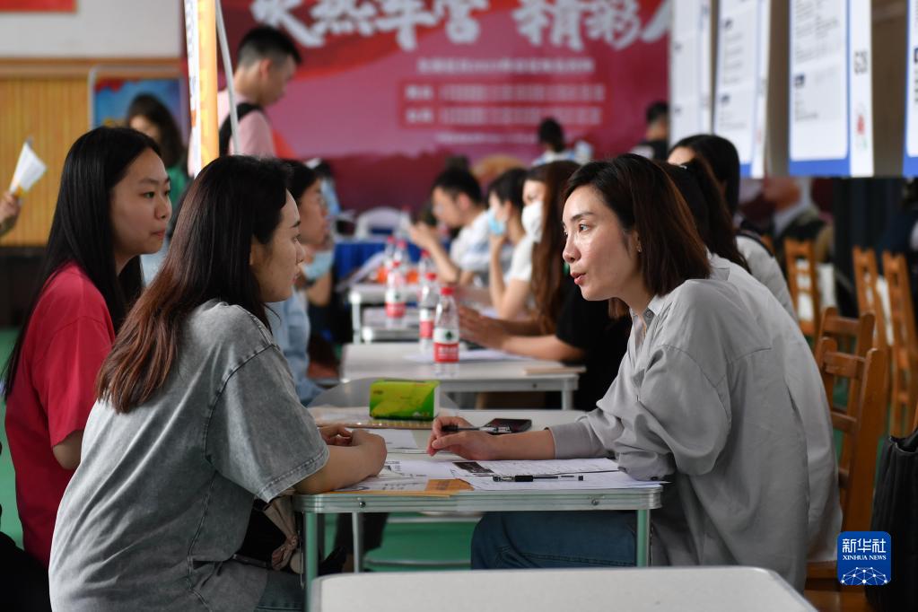 5月19日,在中南林業(yè)科技大學(xué)涉外學(xué)院,應屆畢業(yè)生與招聘人員(右)交流。