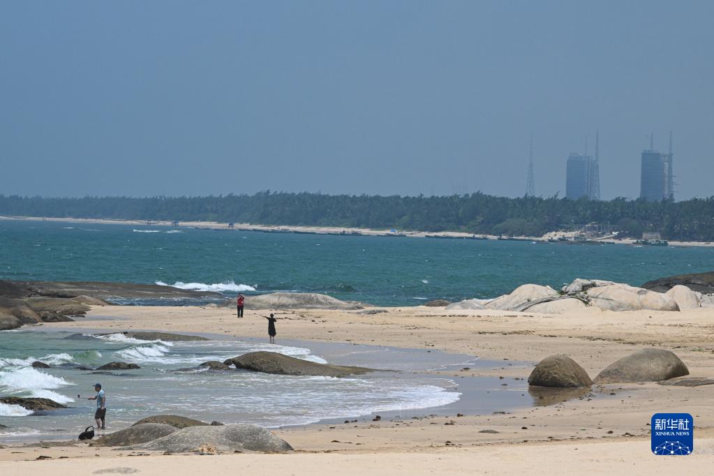 5月17日,游客在海南省文昌市淇水灣游玩,這里可以望見(jiàn)文昌航天發(fā)射場(chǎng)的發(fā)射塔架。