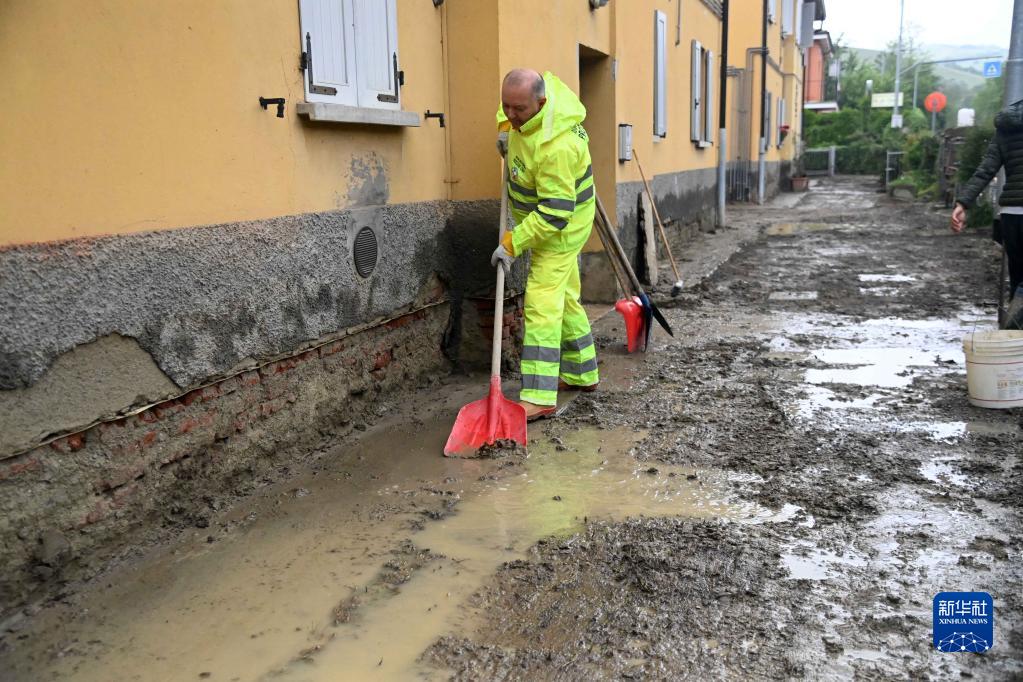 5月19日,在意大利北部艾米利亞-羅馬涅大區博洛尼亞,應急人員清理路面。