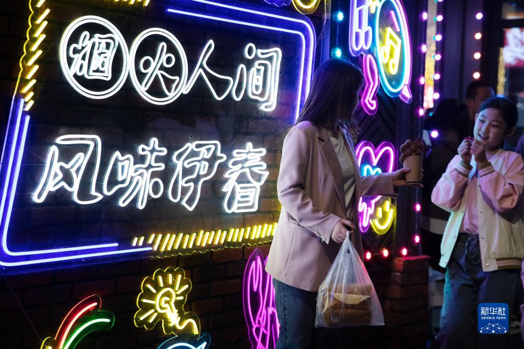 5月19日,游客在伊春夜市內休閑游覽。
