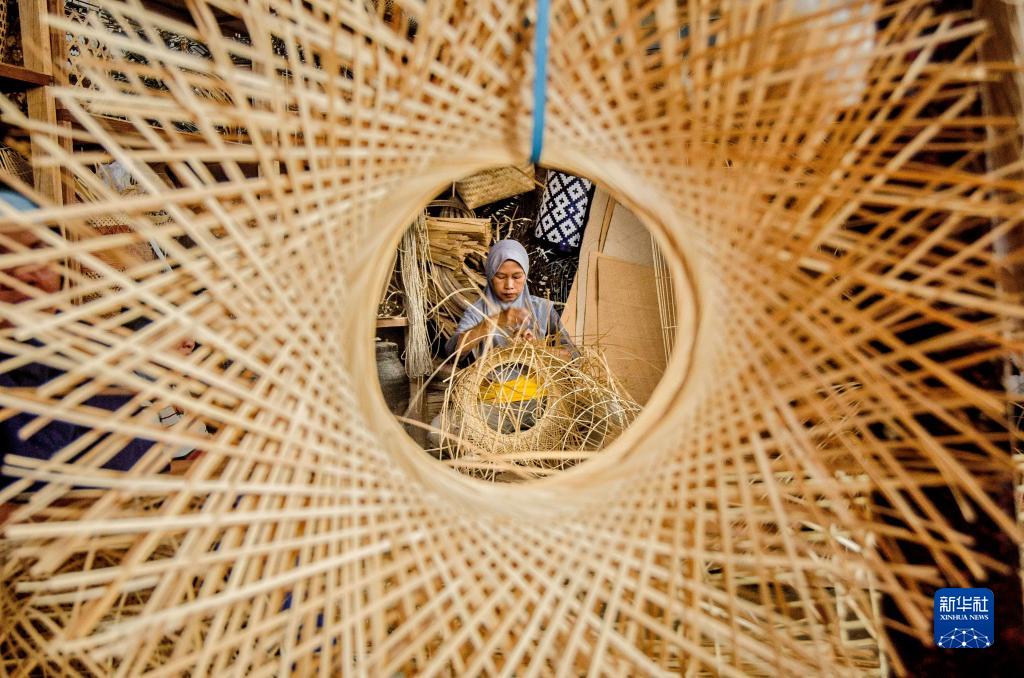 5月17日,一名女子在印度尼西亞日惹斯勒曼的一處手工工坊制作竹編制品。