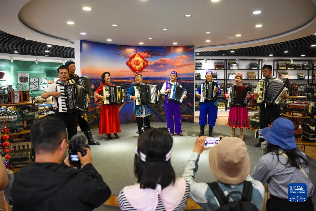 在伊寧市六星街,游客在亞歷山大手風(fēng)琴珍藏館欣賞多民族手風(fēng)琴樂(lè )隊的表演(5月19日攝)。