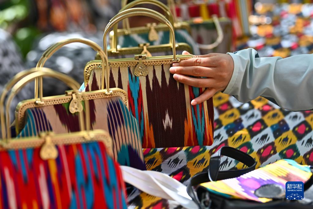 游客在伊寧市六星街選購手工制作的花包(5月19日攝)。