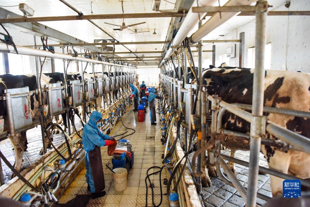 在新疆伊寧市巴彥岱鎮奶牛養殖場(chǎng),工人使用自動(dòng)擠奶設備擠牛奶(5月19日攝)。