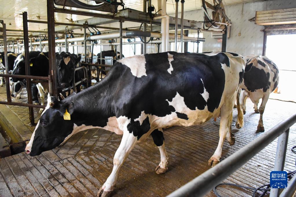 在新疆伊寧市巴彥岱鎮奶牛養殖場(chǎng),擠完奶的奶牛排隊走出擠奶廳(5月19日攝)。