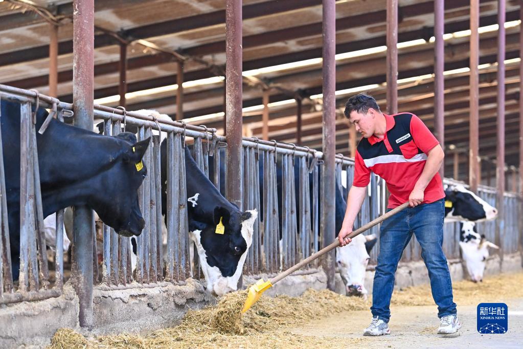 在新疆伊寧市巴彥岱鎮奶牛養殖場(chǎng),工人在打掃牛舍(5月19日攝)。