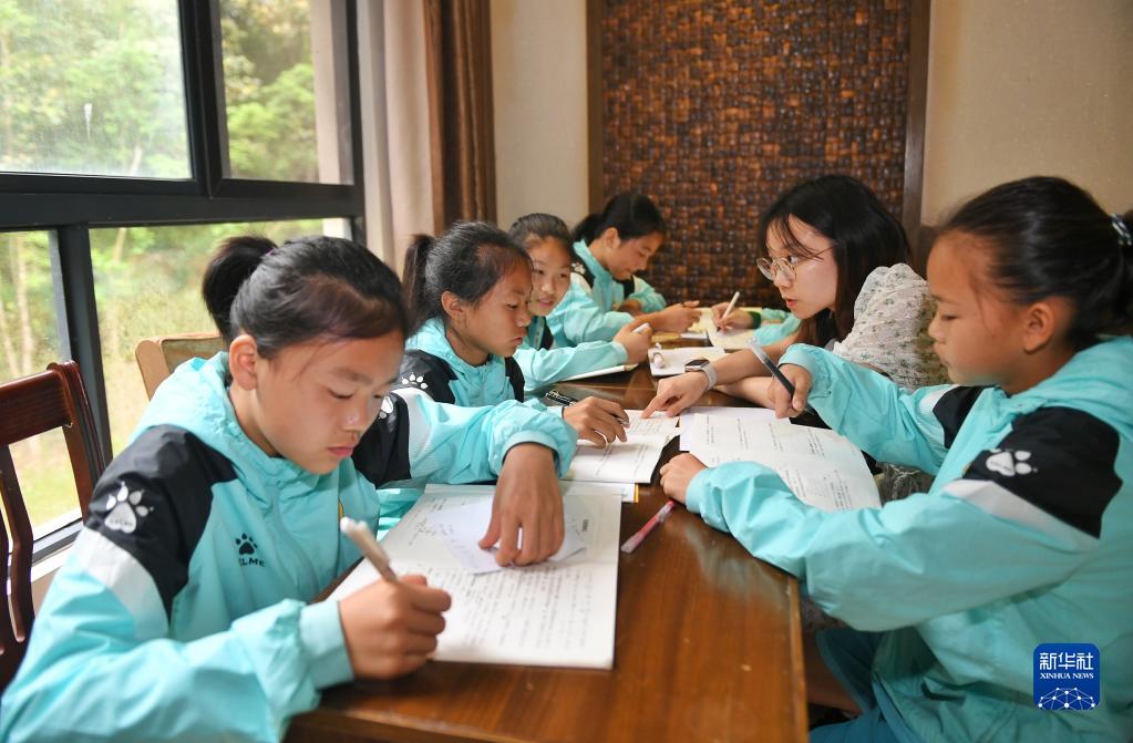 在海南瓊中縣舉辦的中國足協(xié)女足青訓中心“希望杯”U12組比賽的空閑時(shí)段,來(lái)自涼山彝族自治州的四川隊隊員舍布么扯鳩莫(左二)和隊友們在老師帶領(lǐng)下學(xué)習文化課(4月10日攝)。