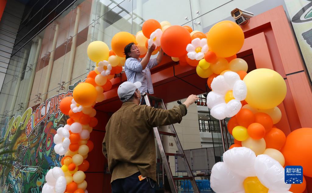 在上海虹口區青少年活動(dòng)中心,劉瑩在伙伴的協(xié)助下為氣球拱門(mén)安裝花樣裝飾(5月18日攝)。