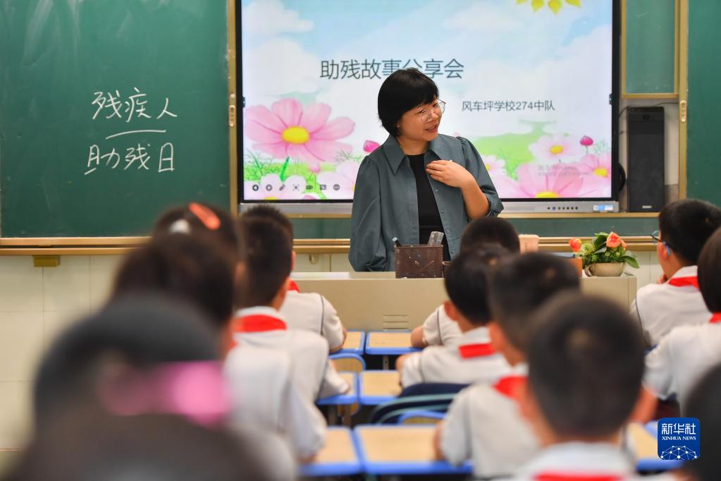 在湘潭市雨湖區風(fēng)車(chē)坪學(xué)校,扶婷向五年級學(xué)生分享她的助殘故事(5月19日攝)。