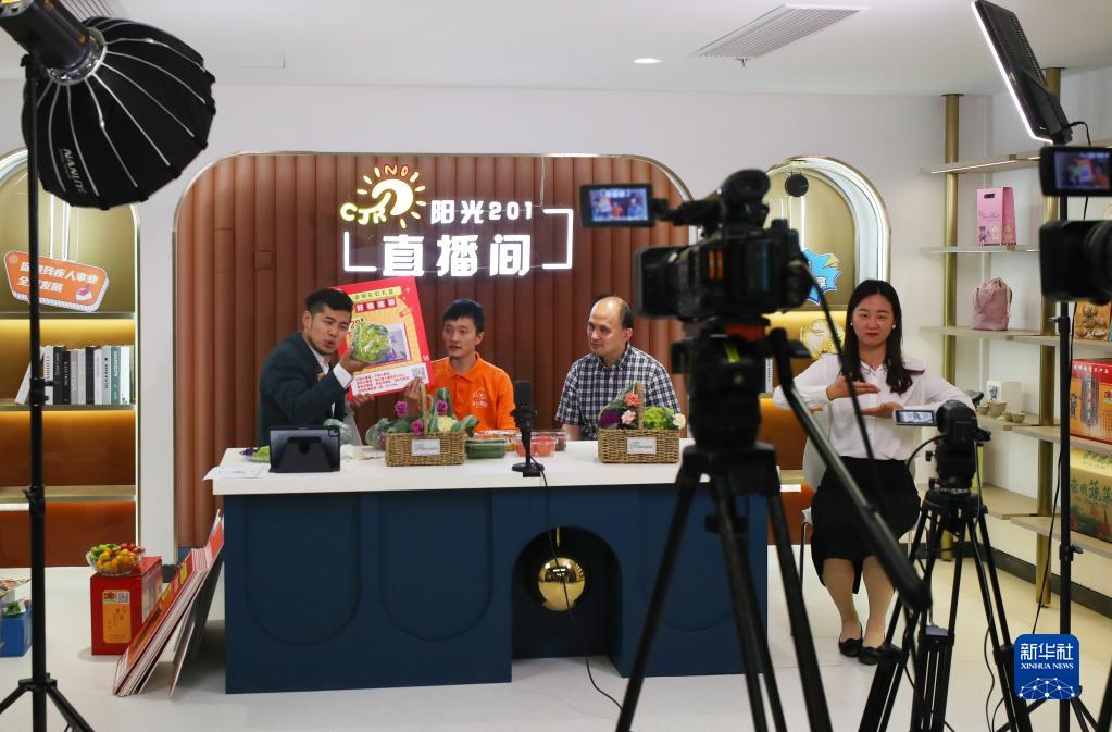 5月20日,來(lái)自崇明區的一家殘疾人蔬果種植合作社的工作人員(左二),在“陽(yáng)光201”平臺直播間內進(jìn)行配備手語(yǔ)翻譯的無(wú)障礙直播銷(xiāo)售。