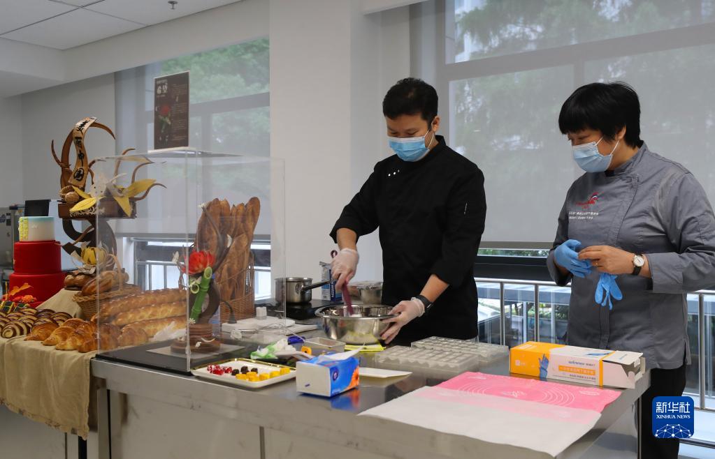 5月20日,上海市現代食品職業(yè)技能培訓中心校長(cháng)干文華(右)和她的聽(tīng)障學(xué)生余游波(左)在位于“陽(yáng)光201”平臺的工作室內制作巧克力。