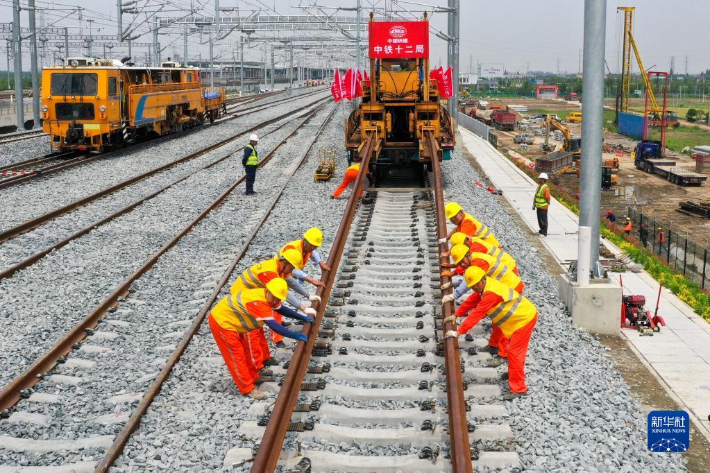 5月20日,在滬寧沿江高鐵太倉站施工現場(chǎng),中鐵十二局的工程人員利用機械將鋼軌放入承軌槽(無(wú)人機照片)。