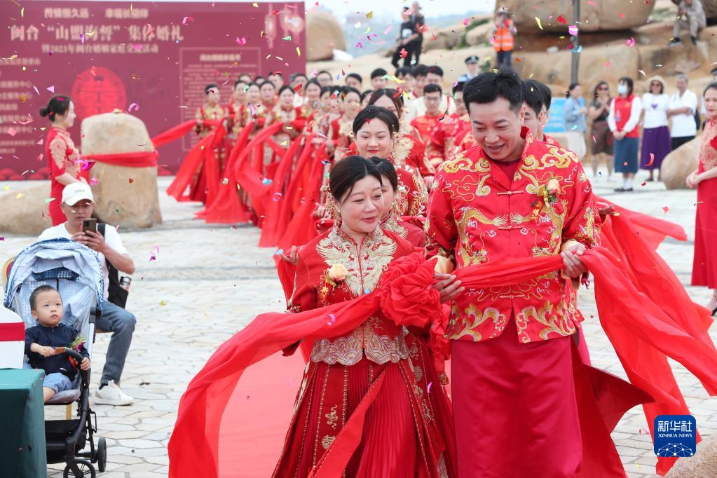 當日,一場(chǎng)以“愛(ài)情恒久遠、幸福長(cháng)相伴”為主題的閩臺“山盟海誓”集體婚禮暨2023年閩臺婚姻家庭交流活動(dòng)在福建省福州市平潭縣舉辦。21對閩臺新人身穿紅色中式婚服,手牽紅繡球,行跨火盆、踩瓦片、扎繡球和“合茶”、“合巹”、“海誓”等閩臺傳統結婚禮儀,結下跨越海峽的姻緣。