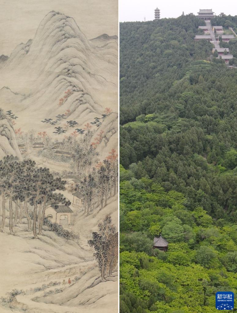 這是一張拼版照片,左圖為:《八公秋霽圖》,由清代畫(huà)家潘思牧創(chuàng )作,現收藏于安徽博物院(新華社發(fā),李鵬飛 攝);右圖為:5月16日拍攝的位于安徽省淮南市壽縣的八公山風(fēng)景區(無(wú)人機照片,新華社記者張端攝)。