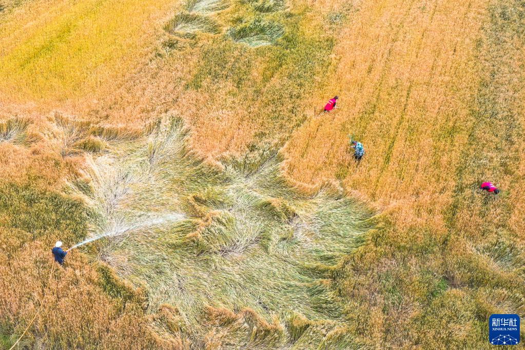 5月20日,在浙江省湖州市長(cháng)興縣煤山鎮新源村,農民在麥田除草補水(無(wú)人機照片)。