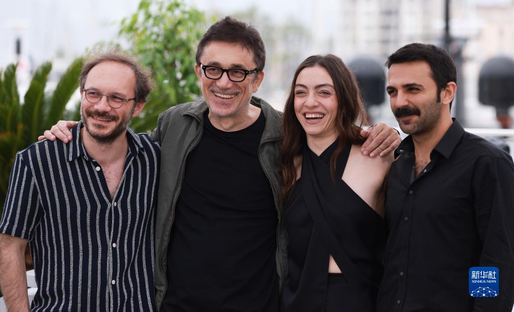 5月20日,在法國戛納舉行的第76屆戛納國際電影節上,土耳其影片《枯草》的導演努里·比格·錫蘭(左二)攜演員亮相拍照式。
