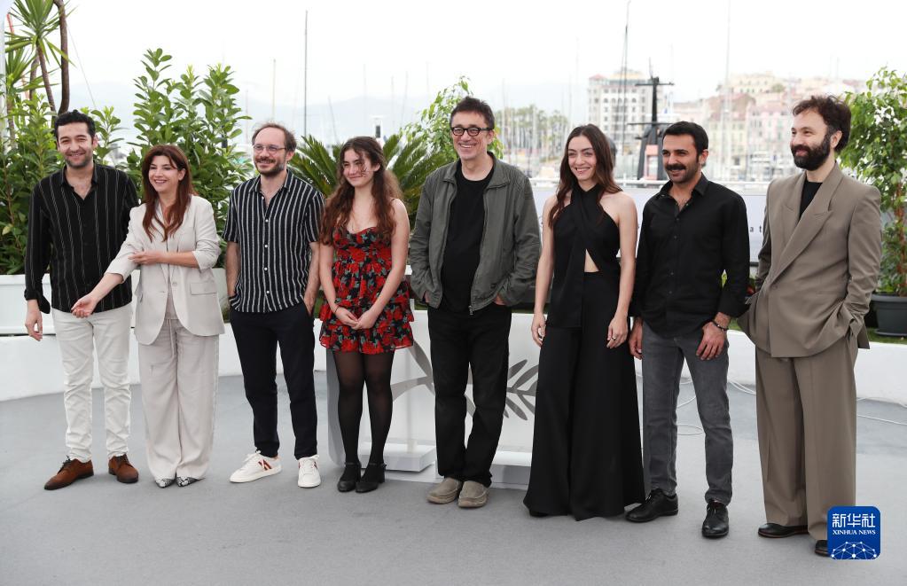 5月20日,在法國戛納舉行的第76屆戛納國際電影節上,土耳其影片《枯草》的導演努里·比格·錫蘭(右四)攜主創(chuàng )人員亮相拍照式。