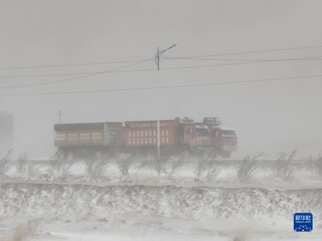 5月20日,在蒙古國蘇赫巴托爾省,貨車(chē)在暴風(fēng)雪中行駛。
