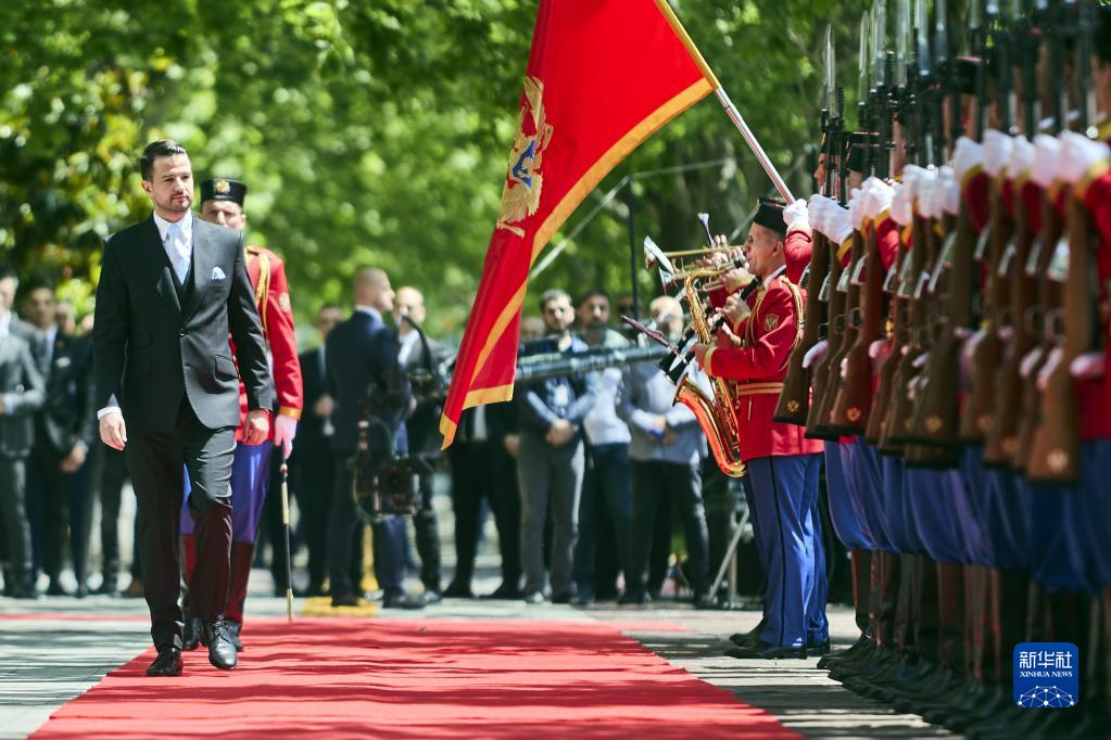 5月20日,在黑山共和國首都波德戈里察,黑山共和國當選總統米拉托維奇(左)在就職儀式現場(chǎng)檢閱儀仗隊。