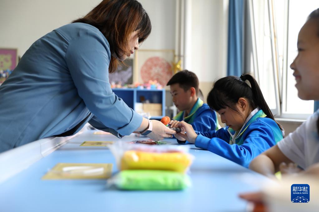 5月19日,莊巖帶著(zhù)學(xué)生在美工教室內上手工美術(shù)課,她握著(zhù)一名同學(xué)的手,讓其感受手工成品的樣子和細節。