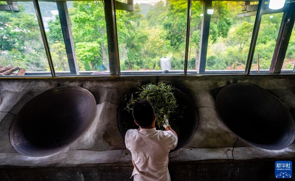 這是2023年5月17日,中國云南省勐??h布朗山布朗族鄉的茶農在炒茶。
