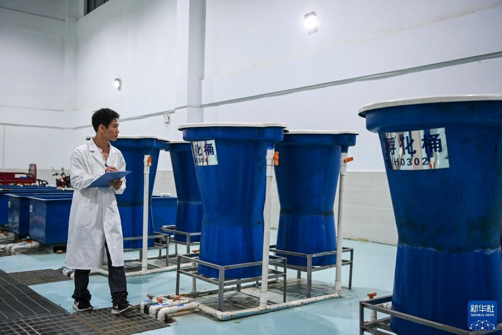 5月20日,技術(shù)人員在廣西大藤峽水利樞紐工程魚(yú)類(lèi)增殖放流站查看魚(yú)苗孵化桶。