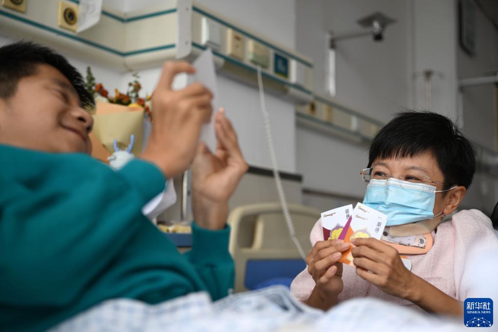 在天津市武清區人民醫院病房?jì)?,魏瑞紅和住院的病友做游戲(5月19日攝)。