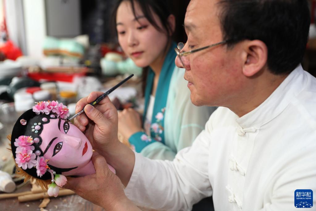 5月21日,在山東青島,姜玉濤給徒弟教授木偶勾臉技藝。