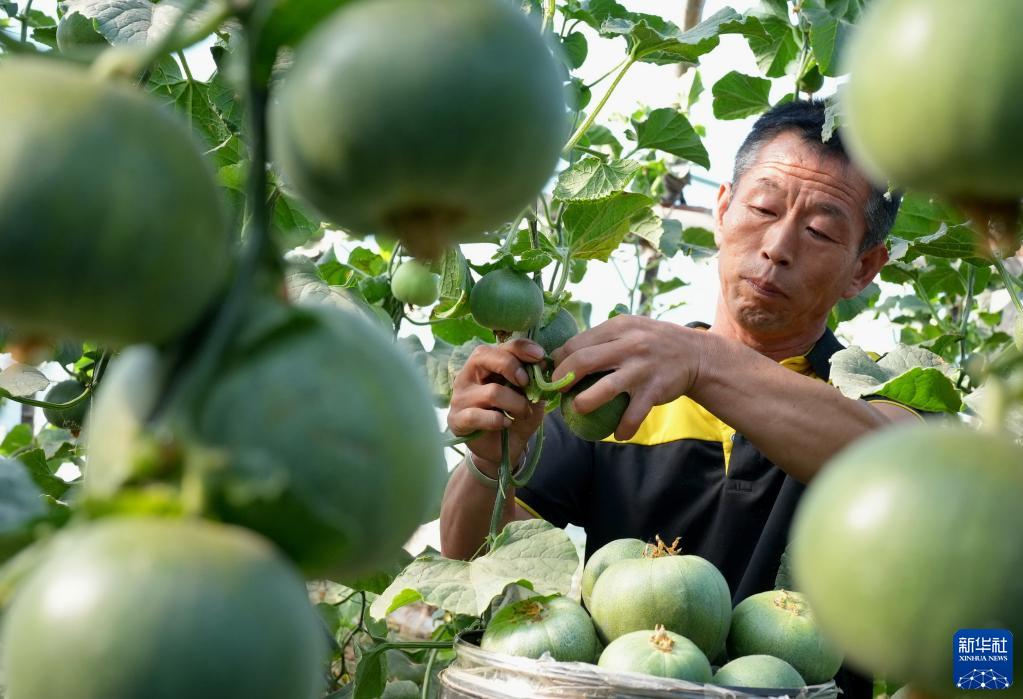 5月21日,河北省灤州市小馬莊鎮農民在大棚內采摘甜瓜。