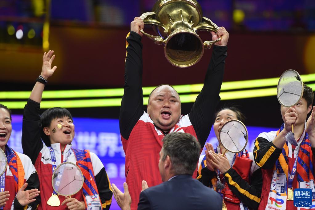 5月21日,中國羽毛球協(xié)會(huì )主席張軍(中)在頒獎儀式上舉起蘇迪曼杯。