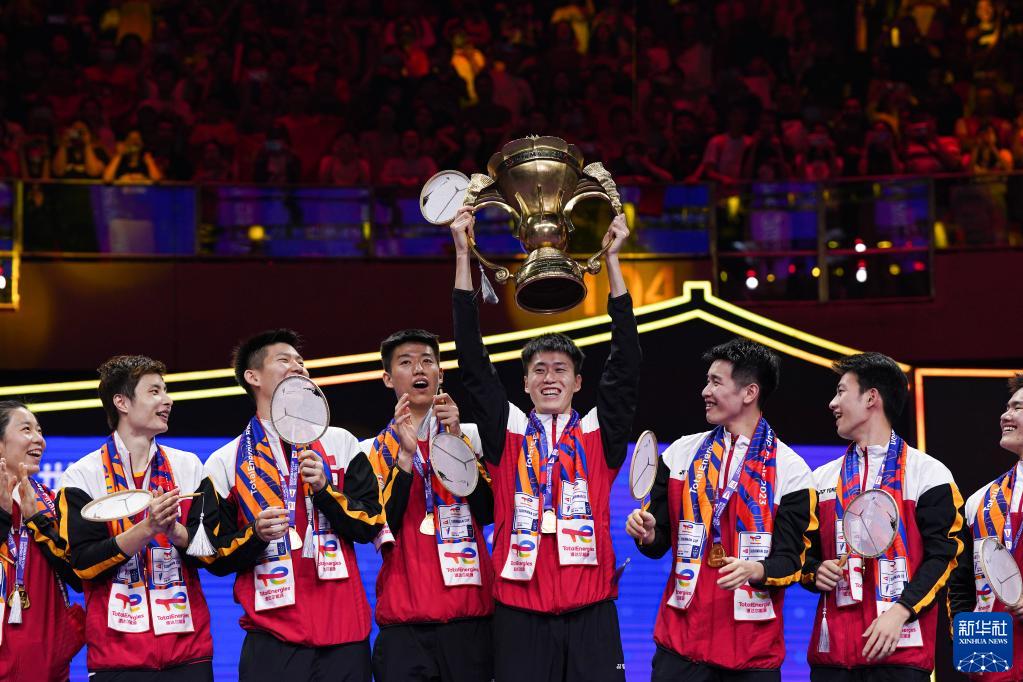 5月21日,中國隊選手歐烜屹(左五)在頒獎儀式上舉起蘇迪曼杯。
