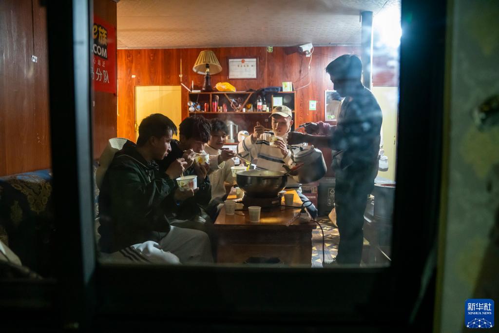 在珠峰游客大本營(yíng)的帳篷旅館里,旦增(右)為客人的牦牛肉湯鍋里加湯料(5月16日攝)。新華社記者 孫非 攝