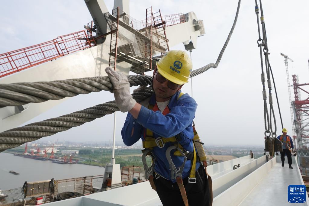 5月21日,在中鐵大橋局常泰長(cháng)江大橋錄安洲專(zhuān)用航道橋施工現場(chǎng),工人在卸鋼梁桿件。