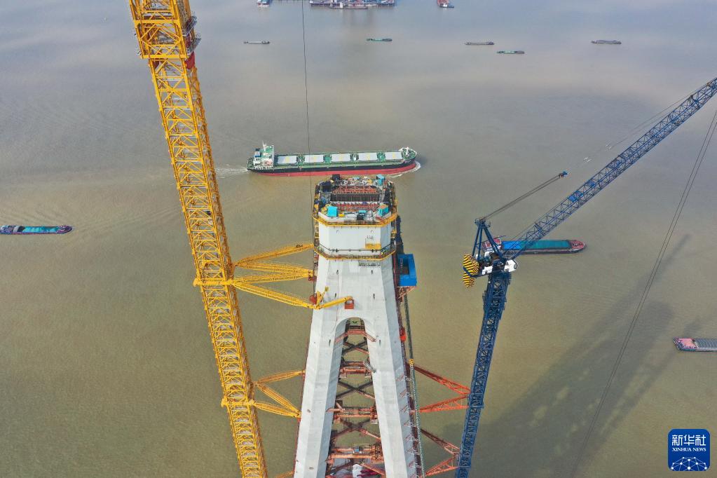 這是中鐵大橋局承建的常泰長(cháng)江大橋六號主塔施工現場(chǎng)(5月21日攝,無(wú)人機照片)。