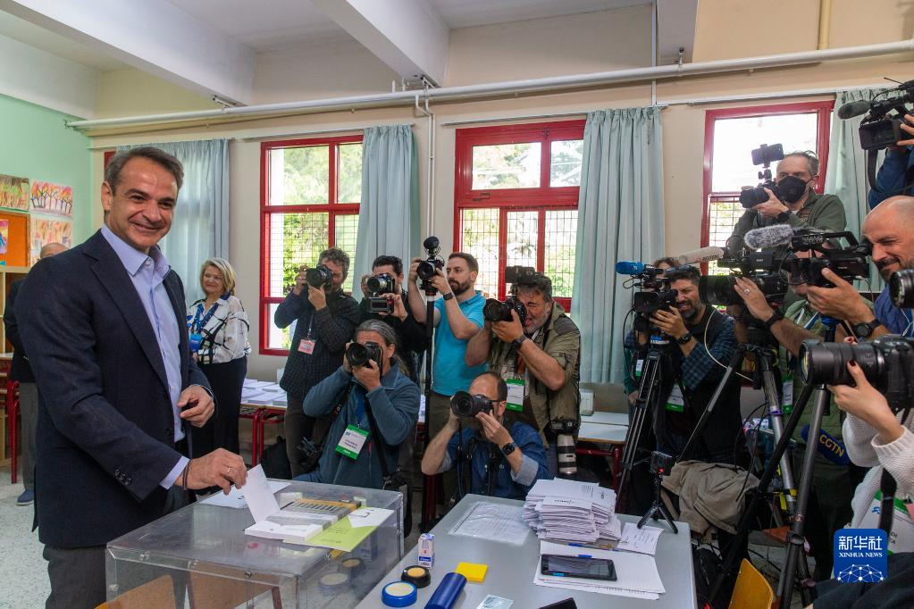 5月21日,希臘總理、新民主黨領(lǐng)導人基里亞科斯·米佐塔基斯在雅典一處投票站投票。
