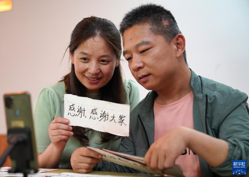 5月16日,谷穗(左)在非遺傳習基地和學(xué)徒一起直播。