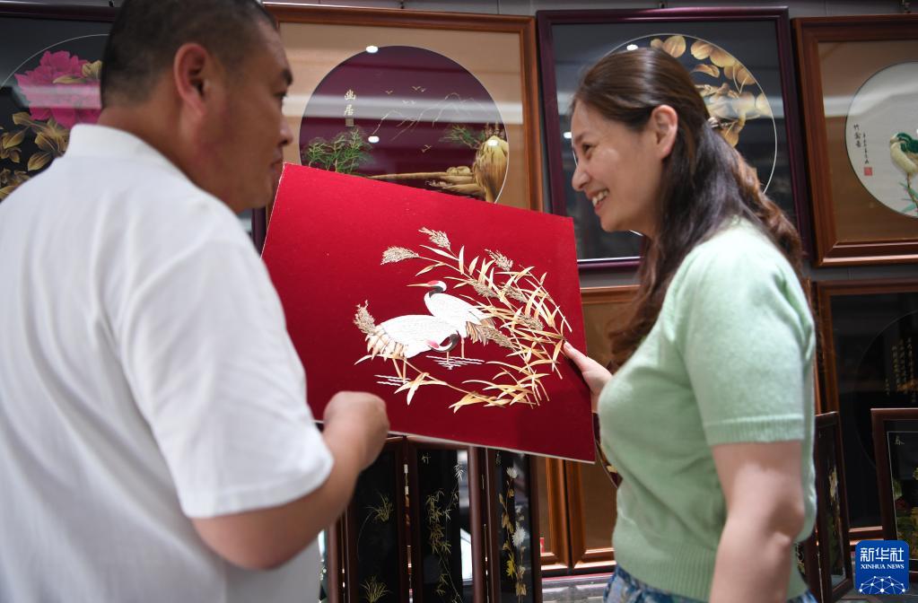 這個(gè)傳習基地,源自于“80后”谷穗和丈夫葛磊創(chuàng )辦的金穗子蘆葦工藝有限公司。谷穗的左臂輕微殘疾。夫妻倆祖輩都是蘆葦畫(huà)手藝人,因此結緣后致力于非遺蘆葦畫(huà)的傳習、生產(chǎn)、研發(fā)和銷(xiāo)售。他們就地取材,以蘆葦的葉、稈、花穗為原料,經(jīng)過(guò)割、曬、晾、碾、貼等30多道工序精心制作成淮陽(yáng)蘆葦畫(huà)。他們的作品經(jīng)常參展并多次獲獎。2021年,淮陽(yáng)蘆葦畫(huà)被評選為河南省非物質(zhì)文化遺產(chǎn)。