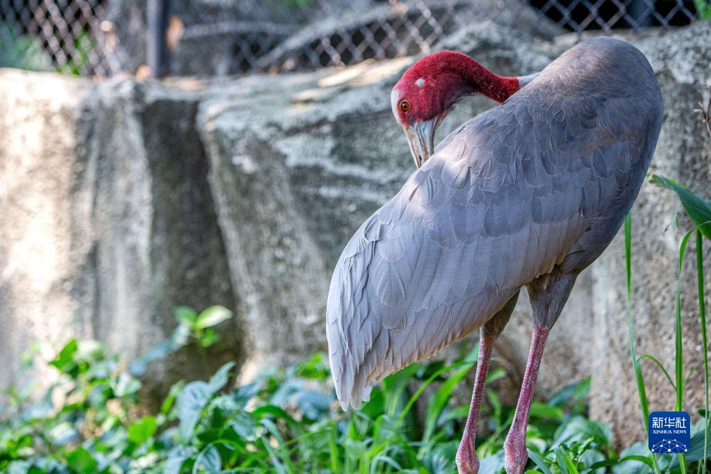 這是5月16日在泰國呵叻府動(dòng)物園赤頸鶴保育中心拍攝的赤頸鶴。