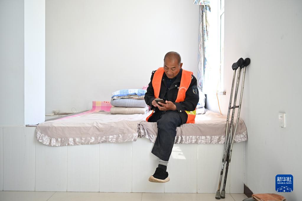 護林員馬裕在管護站用手機查看天氣(5月18日攝)。