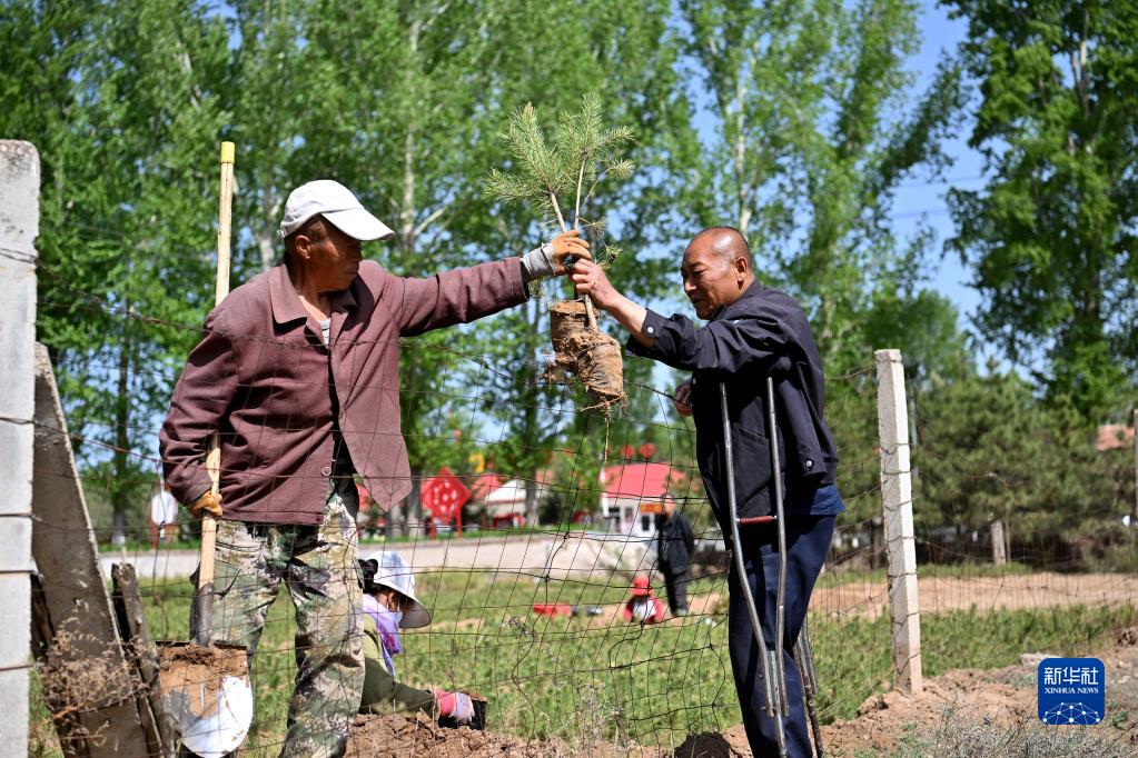 在山西省右玉縣薛家堡村一處苗圃,護林員馬裕從工作人員手中接過(guò)樹(shù)苗準備去林場(chǎng)空地補種(5月18日攝)。