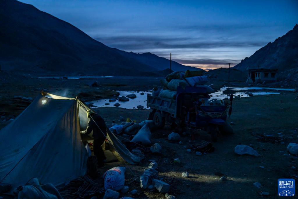 在珠峰登山大本營(yíng)附近,牦牛工喂完牦牛后回帳篷休息(5月17日攝)。
