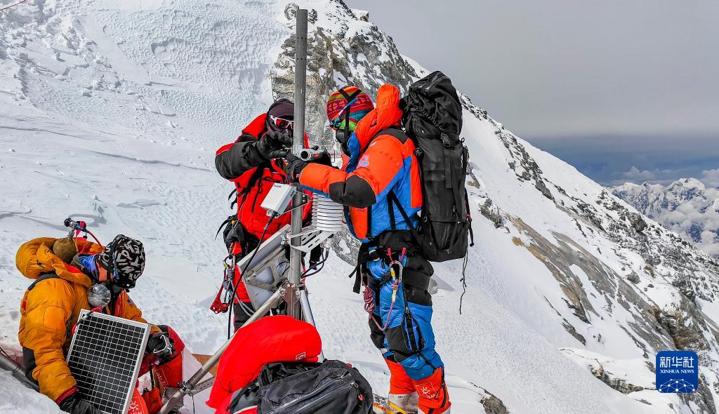 5月23日,科考登頂隊員在珠峰海拔約8830米處維護升級自動(dòng)氣象站。