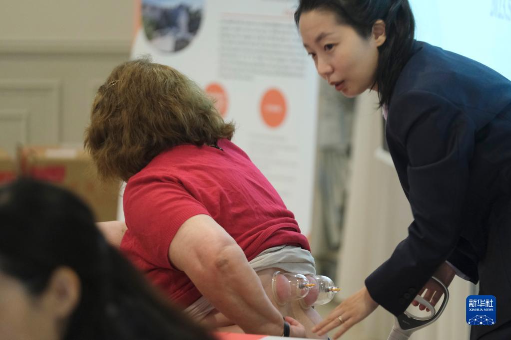 5月22日,在馬耳他保拉市,第18期中國援馬耳他醫療隊隊員史欣瑩為一名婦女進(jìn)行拔罐治療。