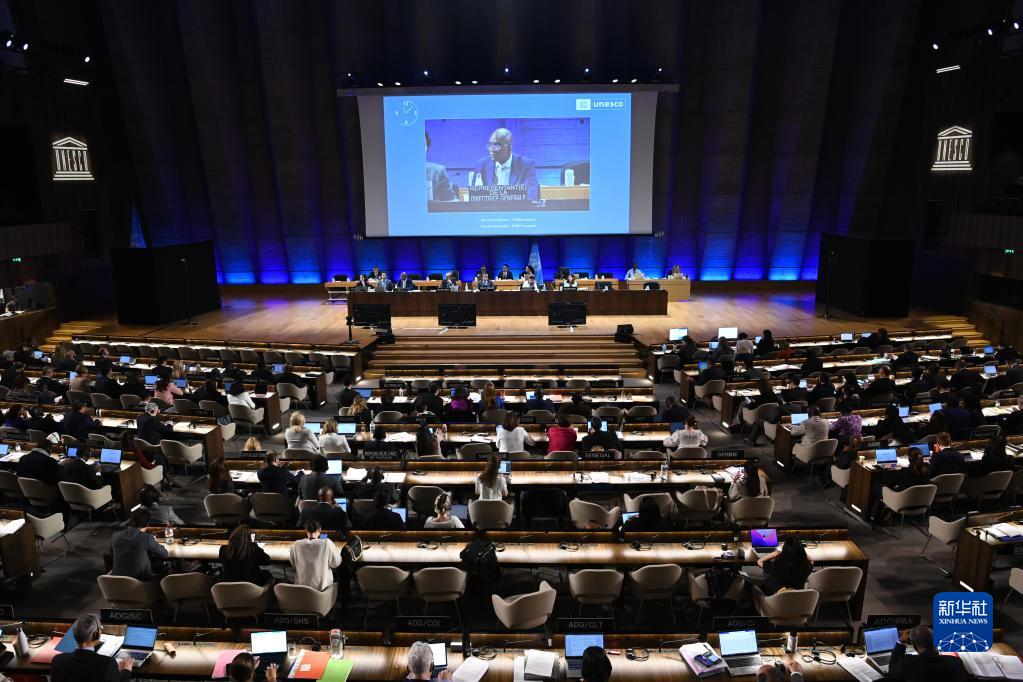 這是5月22日在法國巴黎的聯(lián)合國教科文組織總部拍攝的聯(lián)合國教科文組織執行局第216屆會(huì )議現場(chǎng)。