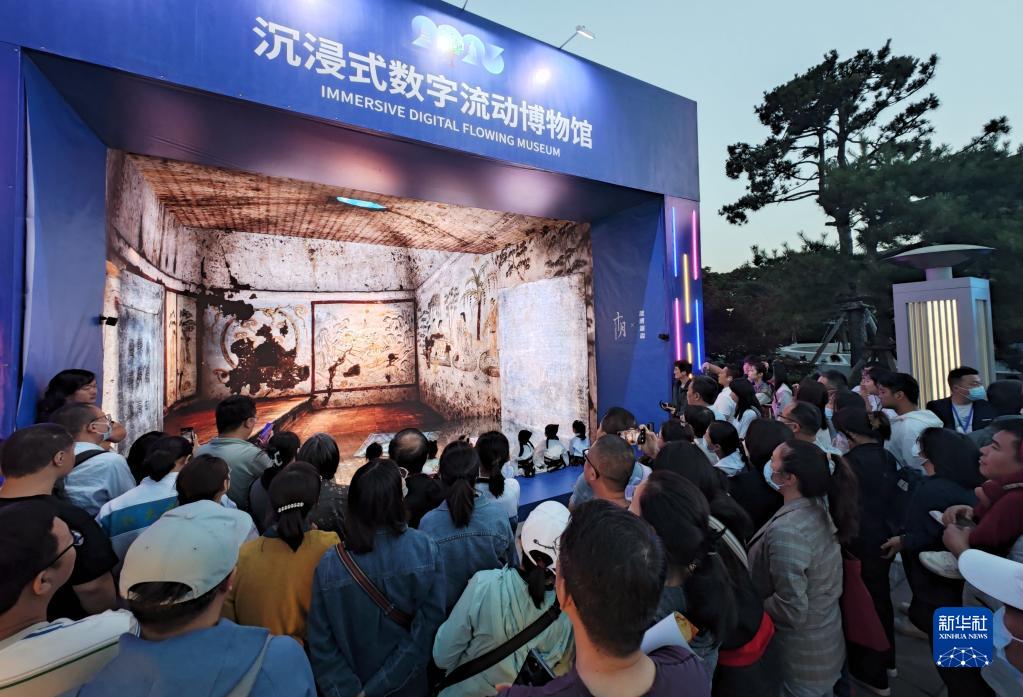 5月22日晚,在2023陜西“博物館與美好生活”文博之夜活動(dòng)上,游客參觀(guān)沉浸式數字流動(dòng)博物館。