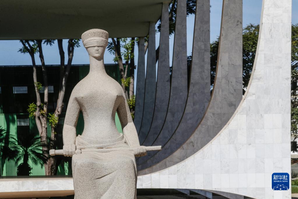 這是5月22日在巴西首都巴西利亞三權廣場(chǎng)聯(lián)邦最高法院前拍攝的一尊雕像。