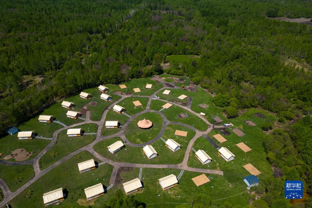 這是5月24日拍攝的伊春森工集團上甘嶺林業(yè)局公司溪水林場(chǎng)在建的溪水野奢帳篷度假酒店項目(無(wú)人機照片)。